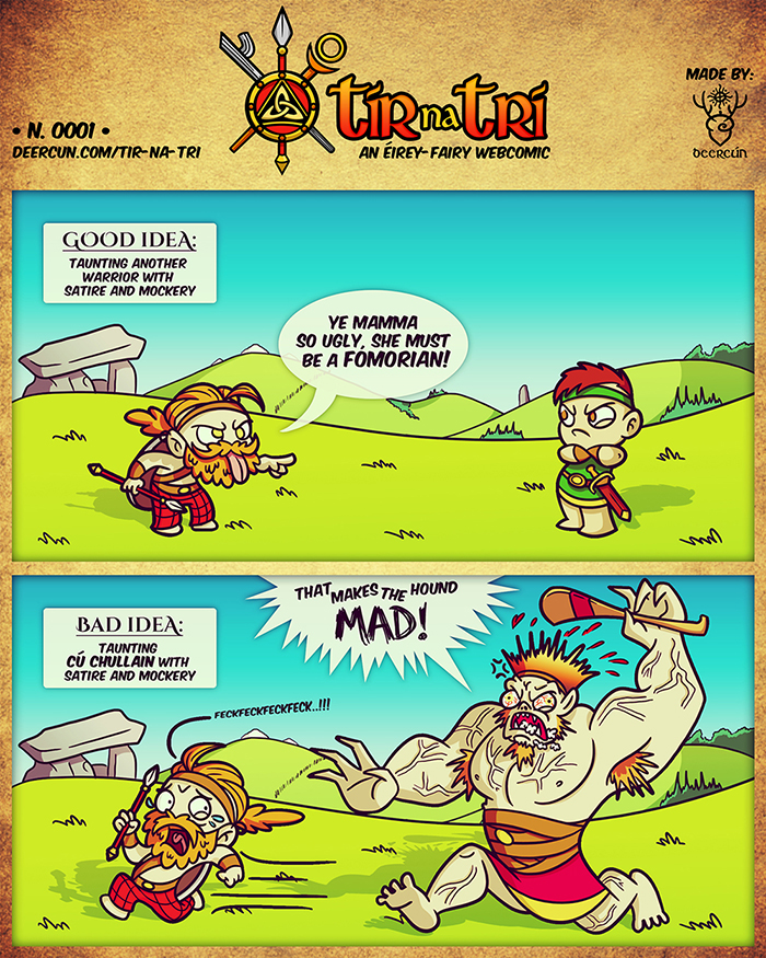 And these were not necessarily just cultural no-nos – oftentimes some sort of force of fate was at play, where the consequent breaking of geasa would undeniably lead a person’s destiny becoming doomed: As Fergal up there reminds us, oftentimes these prohibitions were ridiculously unavoidable and self-fulfilling. Cú Chulainn meets his undoing because he had a taboo on him about consuming the flesh of a dog; but (conveniently for his enemies) he also had a prohibition about refusing hospitality. Thus, all that his enemies had to do to bring down one of the mightiest Irish warriors to ever walk the hills of Ireland (and one who had the power to HULK out, at that) was simply offering him a big warm dish of ol’ Dog Shtew, which he couldn’t refuse, so that by eating it he damns himself and is spiritually weakened for an incoming fight in which he is horribly murdered.