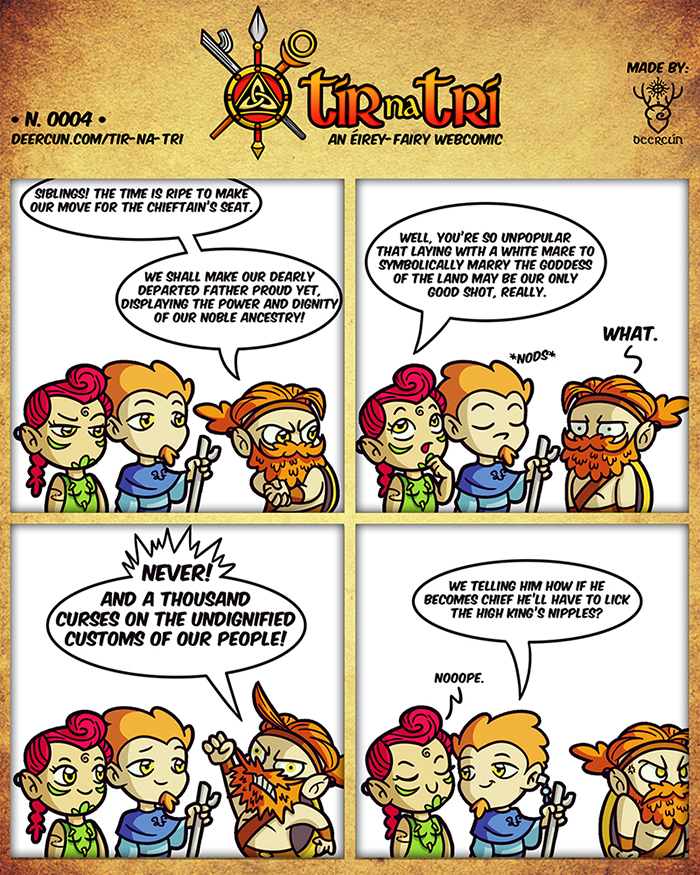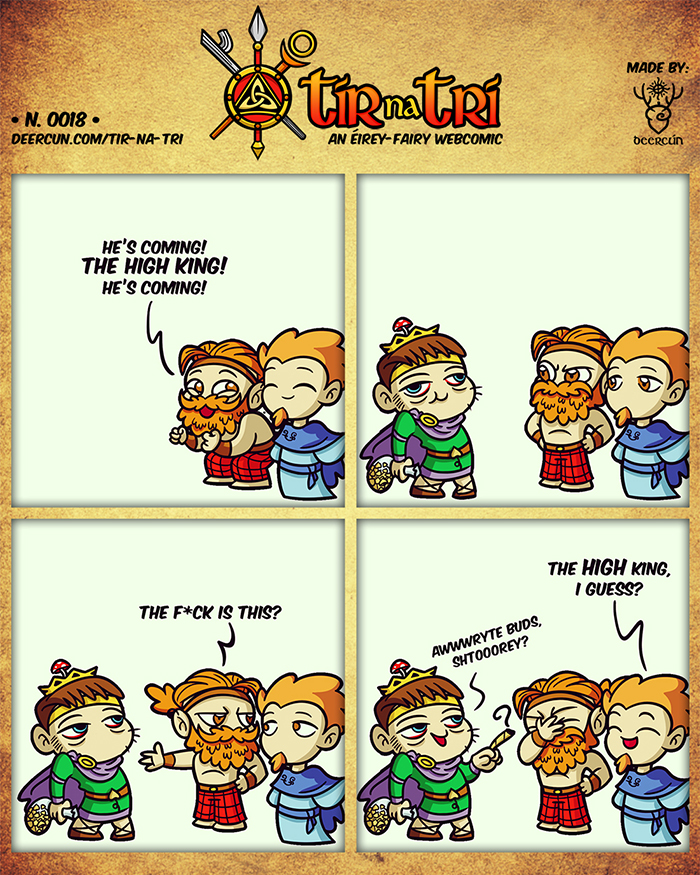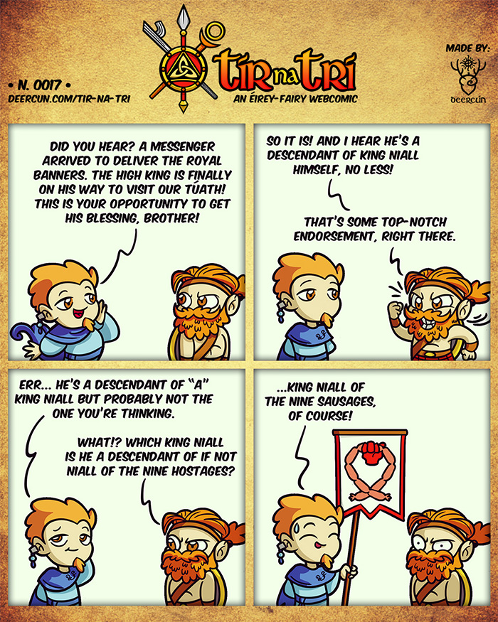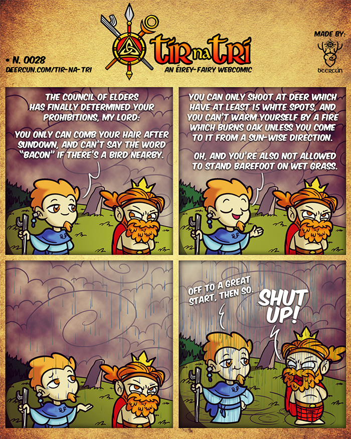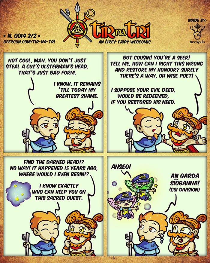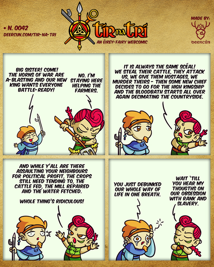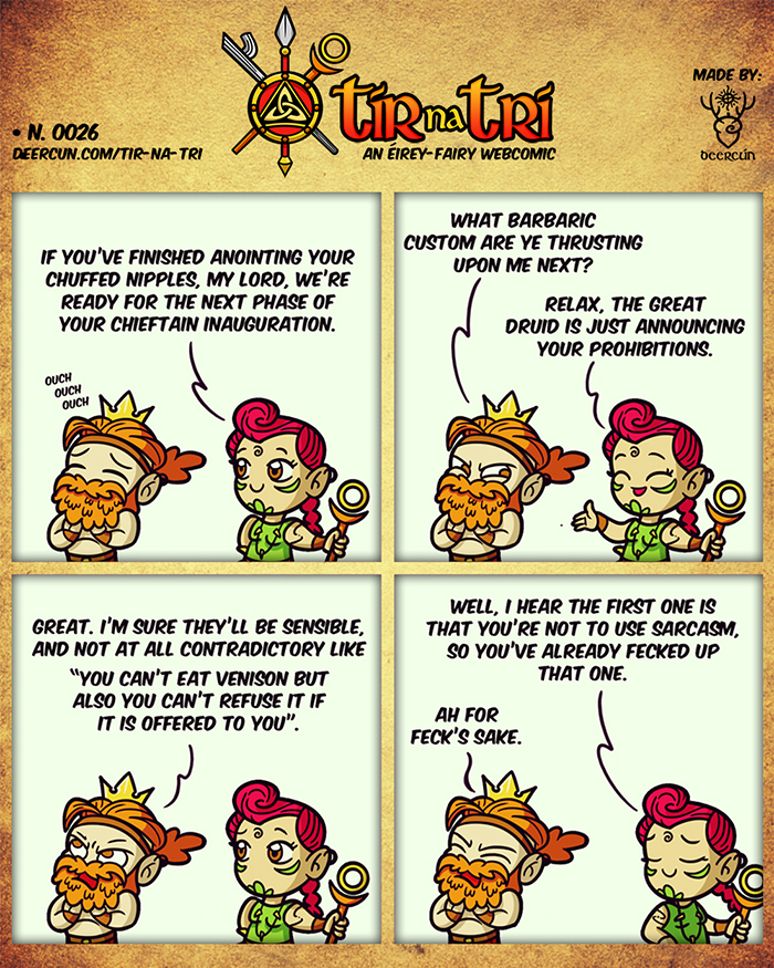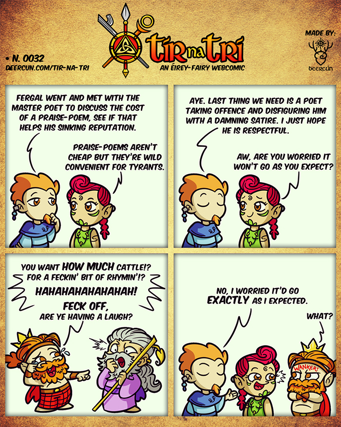 The complex and yet deeply misunderstood role of the institution of Poetry in both Pre-Christian and Christian Ireland is still way away from the reaches of this simple webcomic. It is is easy to understand, however, that in a society as psychotically obsessed with rank and hierarchy as Gaelic Ireland, reputation was EVERYTHING, and it was everything in very concise, factual ways: everything and everyone had an “honor price” which pretty much defined not only your role in society but also how good or crap you had it – moreover, your behaviour could impact your honor price and make you slide up or down the social ladder. The wrong step could turn a King into a Beggar in a wink.