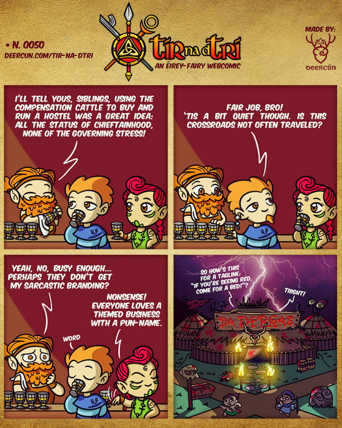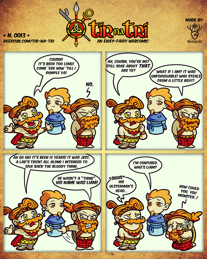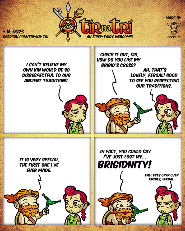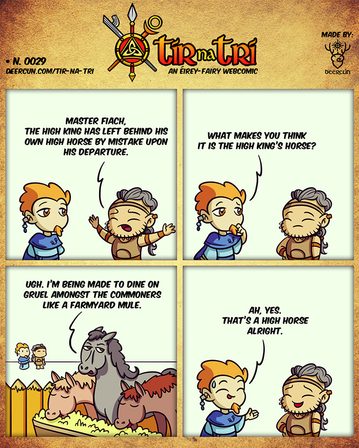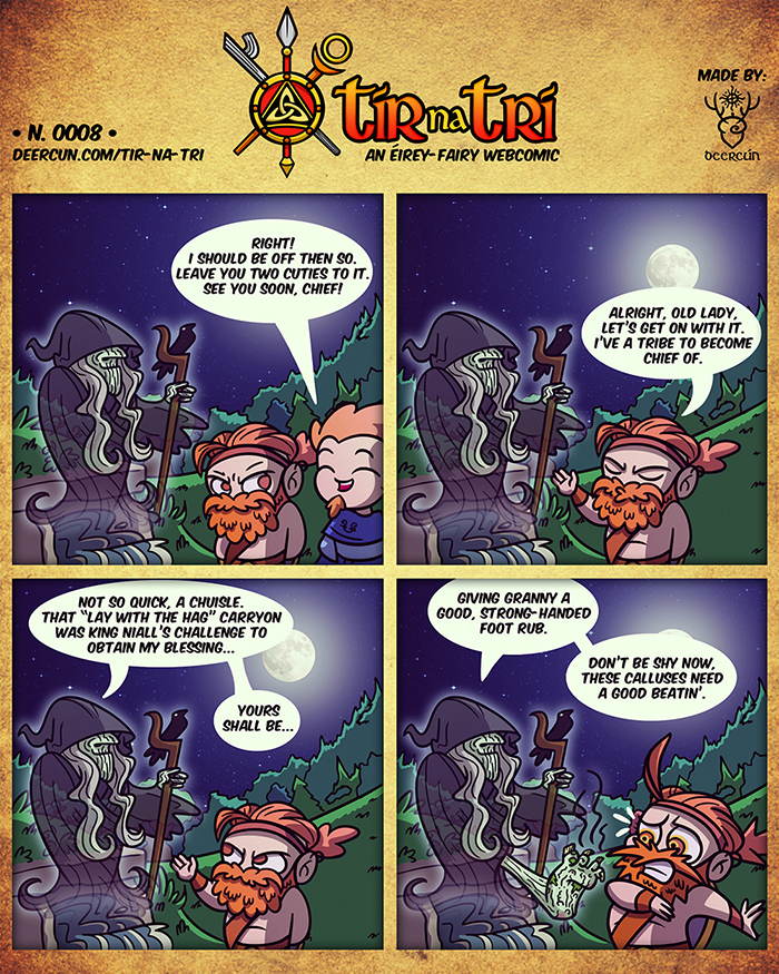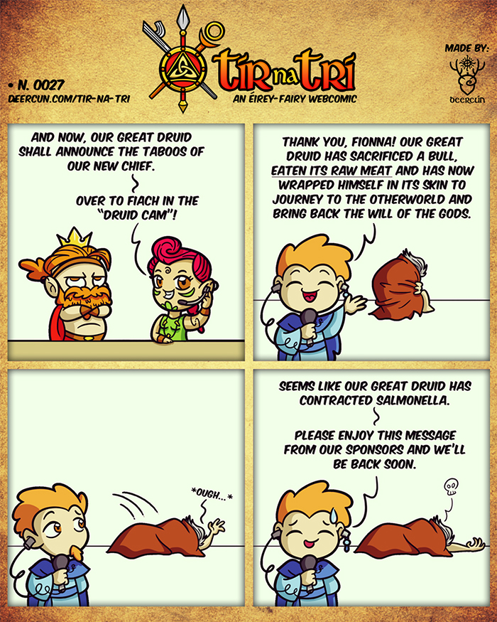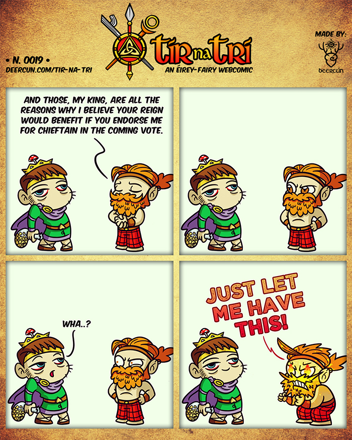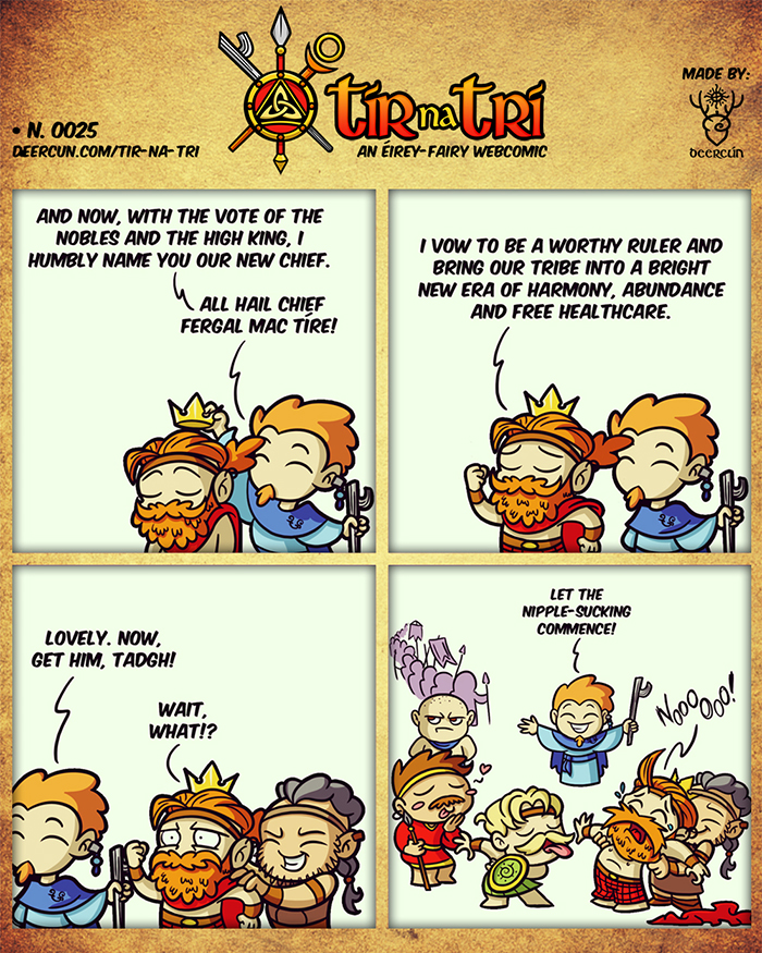 The complex and yet deeply misunderstood role of the institution of Poetry in both Pre-Christian and Christian Ireland is still way away from the reaches of this simple webcomic. It is is easy to understand, however, that in a society as psychotically obsessed with rank and hierarchy as Gaelic Ireland, reputation was EVERYTHING, and it was everything in very concise, factual ways: everything and everyone had an “honor price” which pretty much defined not only your role in society but also how good or crap you had it – moreover, your behaviour could impact your honor price and make you slide up or down the social ladder. The wrong step could turn a King into a Beggar in a wink.
