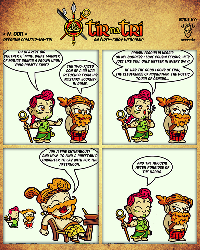 In it, after having sex with The Morrigan, The Dagda is sent by Lugh to spy on the Fomorians before the big battle. After being monstrously ill-treated by them and being force fed a gargantuan portion of porridge on pain of death, the Good God meets the daughter of the Fomorian king Indech, who demands a piggy-back ride back to her father’s house. For some reason, she goes on to beat him up in exchange, which in turns causes him to literally crap himself. Of course, this being an Irish mythological tale where no cause has a logical effect, they proceed to have a poetic battle of wits, which The Dadga wins. The girl, clearly aroused by both defecation AND poetic prowess, ends up having sex with him and then changes sides, offering a great supernatural help to the Dagda against her own people.