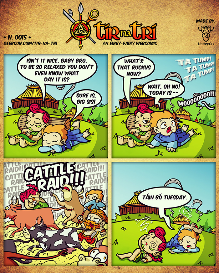 Cattle raiding (a fancy name for “trespassing uninvited into the land of a neighbouring tribe to steal their bovines”) was apparently so prolific in Gaelic Ireland, that it is its own medieval literature genre, alongside Adventures, Voyages, Wooings, Deaths, Conceptions and Feasts. The best known one of them all being, of course, the ‘Táin Bó Cúailnge”, a story of violence and sorrow which reminds us that it is probably never a good idea to go to war over a bull, no matter how virile it may be, and specially if your Seer answers “I behold them bathed in red” every time you ask her how will your army fare in the conflict.