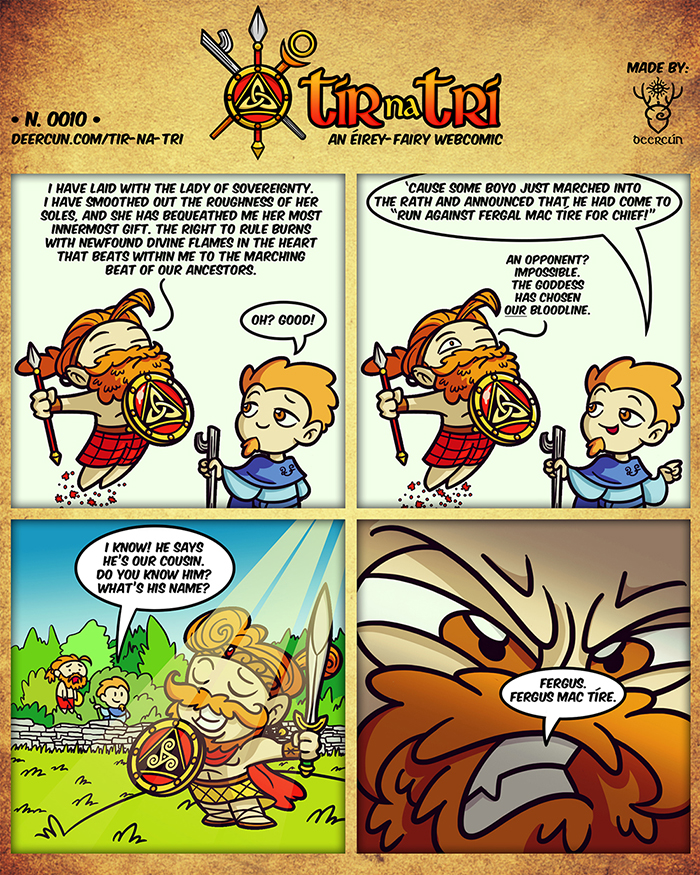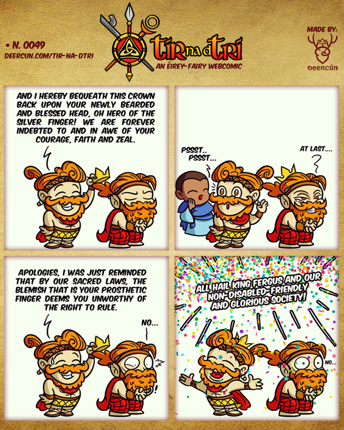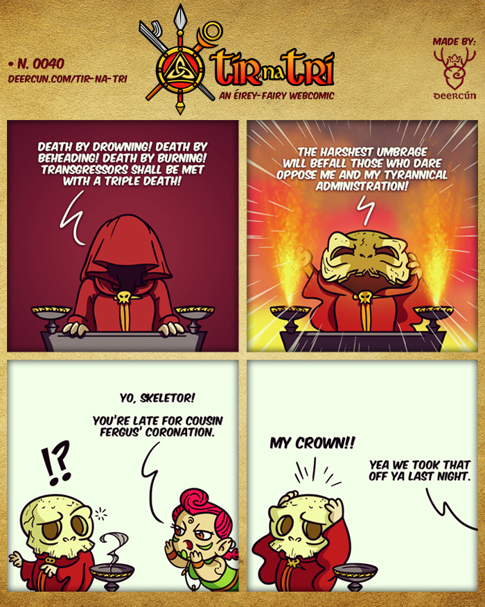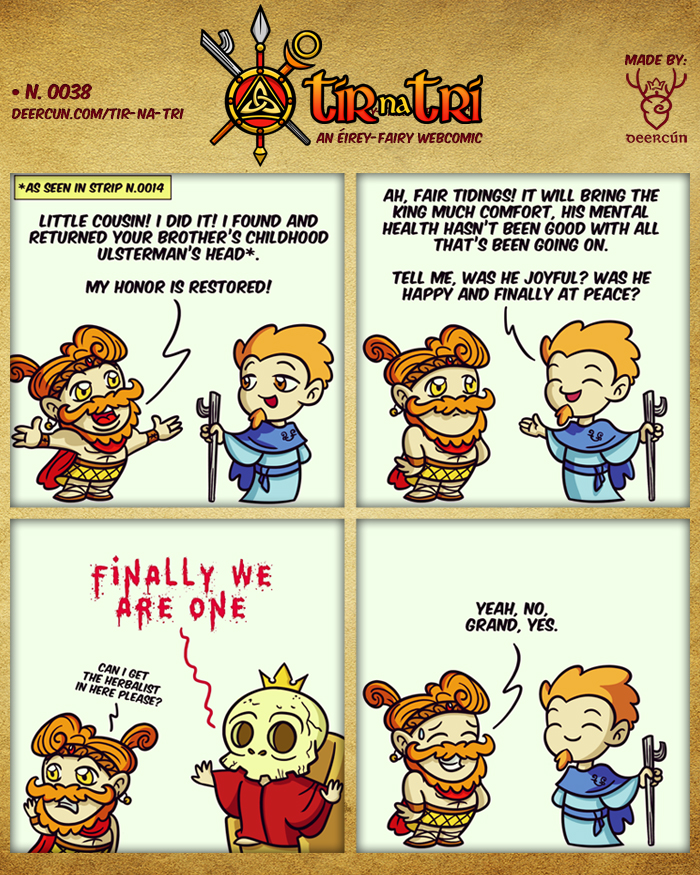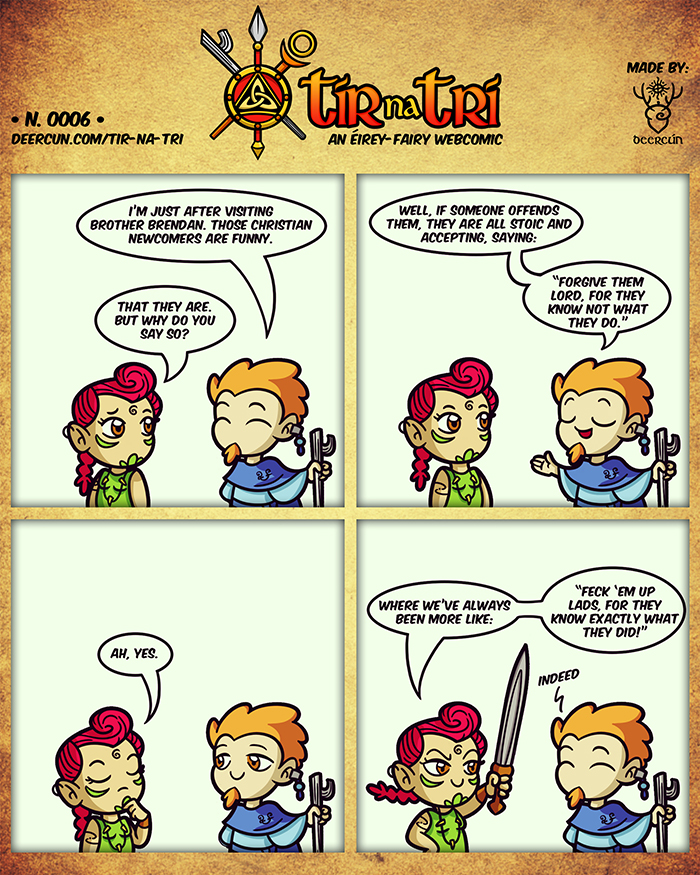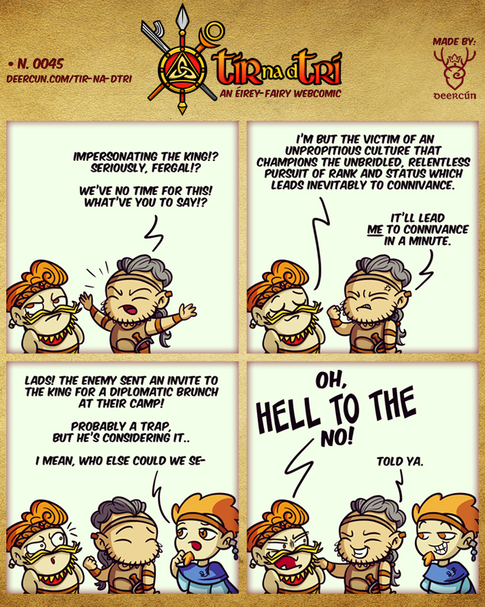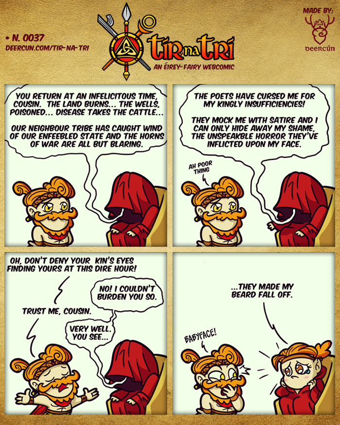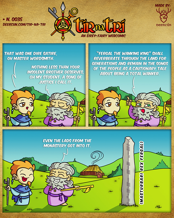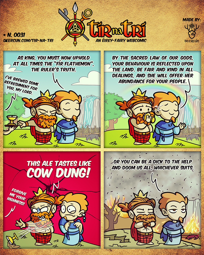 The complex and yet deeply misunderstood role of the institution of Poetry in both Pre-Christian and Christian Ireland is still way away from the reaches of this simple webcomic. It is is easy to understand, however, that in a society as psychotically obsessed with rank and hierarchy as Gaelic Ireland, reputation was EVERYTHING, and it was everything in very concise, factual ways: everything and everyone had an “honor price” which pretty much defined not only your role in society but also how good or crap you had it – moreover, your behaviour could impact your honor price and make you slide up or down the social ladder. The wrong step could turn a King into a Beggar in a wink.